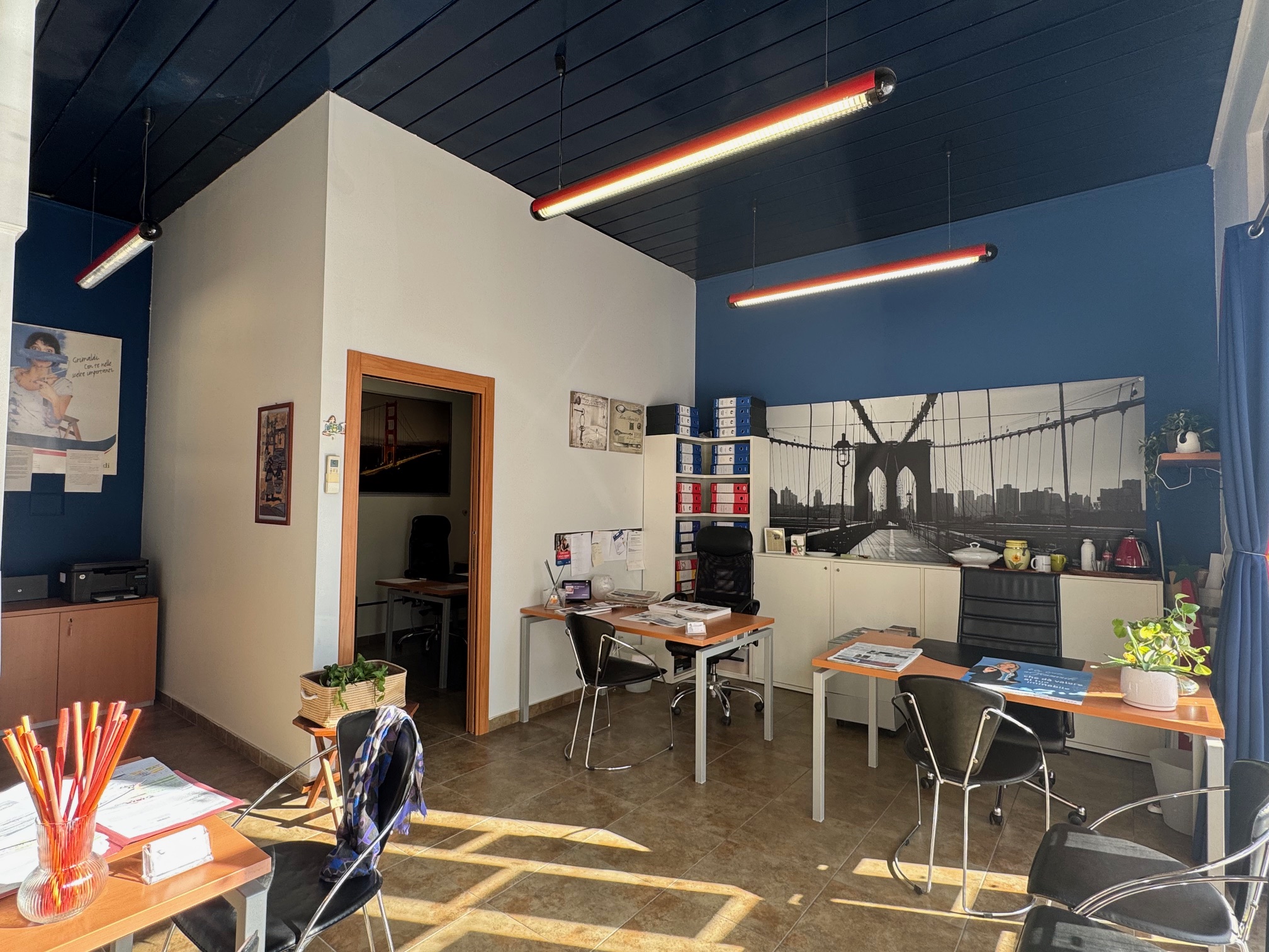 Lo spazio è luminoso e arredato con sobrietà, connessione internet veloce, sala riunioni condivisa, zona attesa clienti, stampante, climatizzazione e servizi igienici.